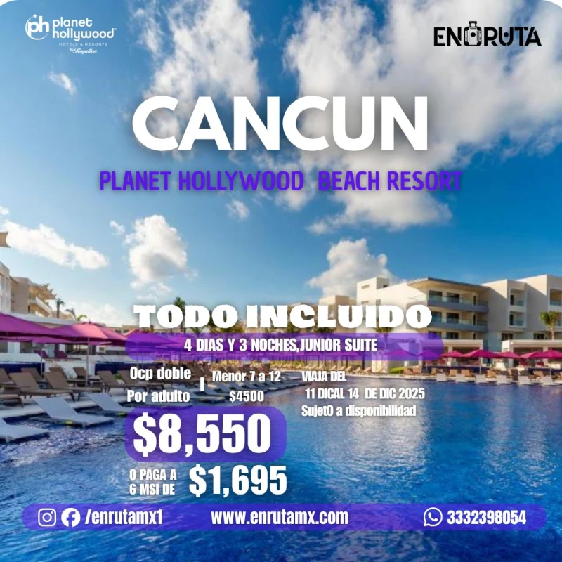 * Pasos: Mándanos un WhatsApp, indica que quieres el paquete "Planet Hollywood Cancun" solicita un plan de pagos a la medida, recibe formulario y paga el enganche.
