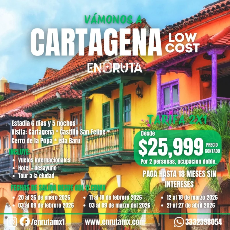 * Pasos: Contáctanos por WhatsApp 33 3239 8054, indica que quieres el paquete Cartagena Low Cost al 2x1, recibe formulario y enlace de pago.