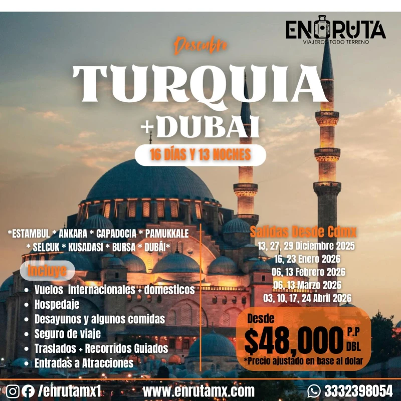 * Pasos: Contáctanos por WhatsApp 33 3239 8054, indica que quieres el paquete Descubre Turquía + Dubái, recibe formulario y enlace de pago.